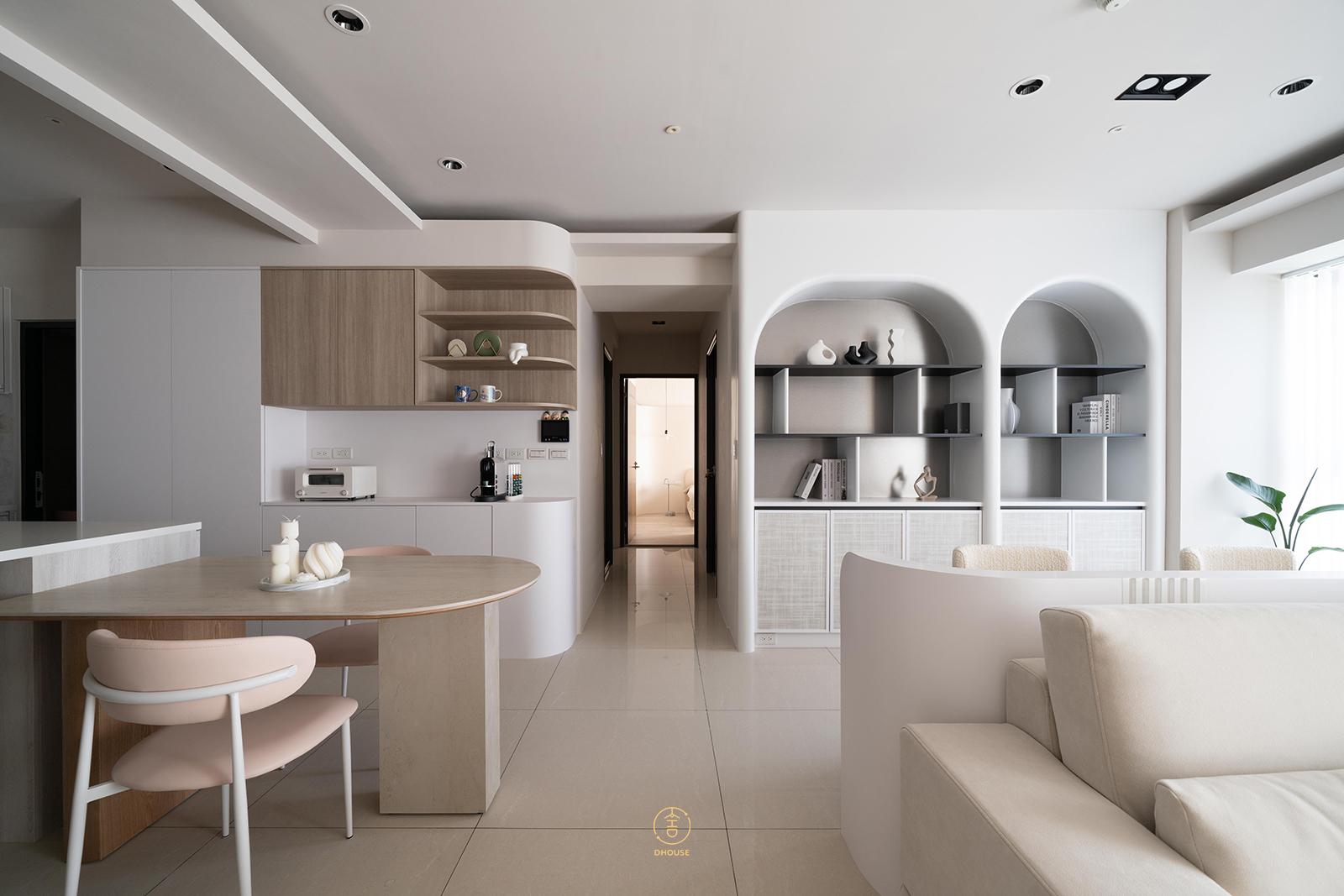 書房區以微高平台加上臥榻設計為亮點,平時作為閱讀區與休憩角落,親友來訪時則化身為多元座位區,機能靈活卻不失統一感。圓弧造型書牆,搭配拱門造景,成為整體空間視覺的核心之一,不僅拉出空間層次,也讓日常多了些故事性。