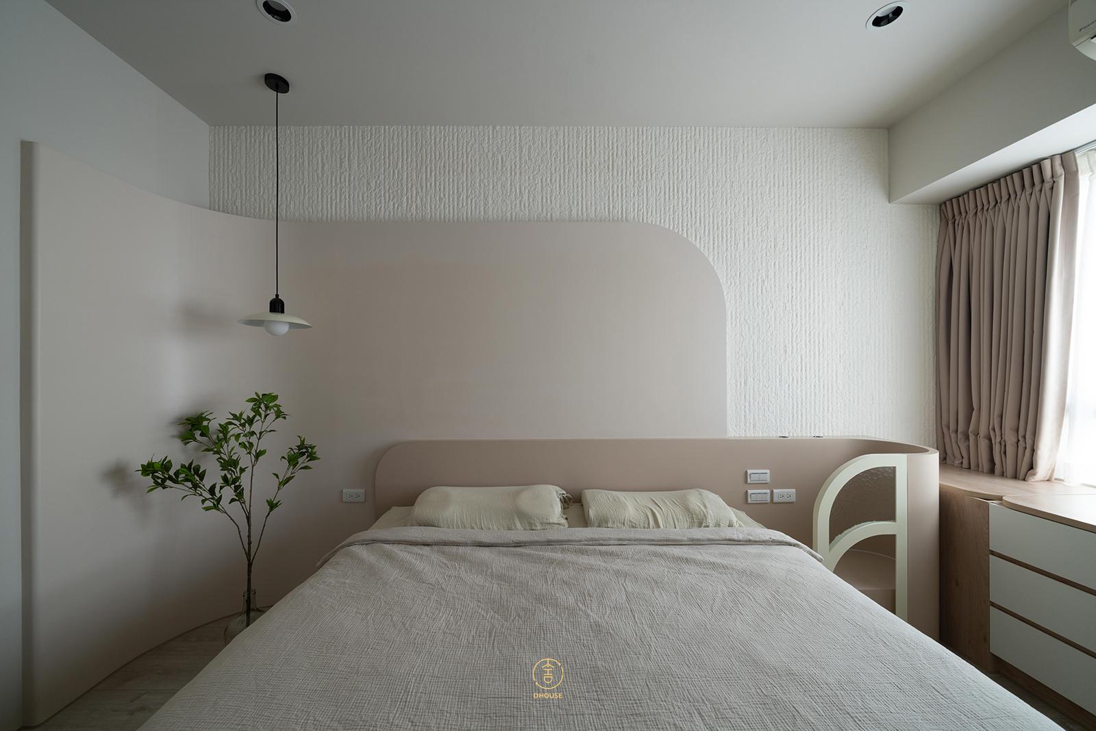 主臥延續景觀設計的概念,將牆面以弧形收邊、床頭牆採用以天然泥土為基底製成的生態軟石板,營造出沉靜柔和的睡眠空間,光線在牆面上緩緩遞進,像是時間靜靜流動的痕跡,無須多餘裝飾,而是透過線條與材質的變化,讓空間自然呼吸,回應屋主對寧靜氛圍的需求,傳遞出空間的安定與溫度。