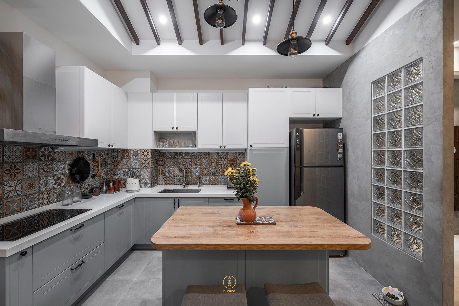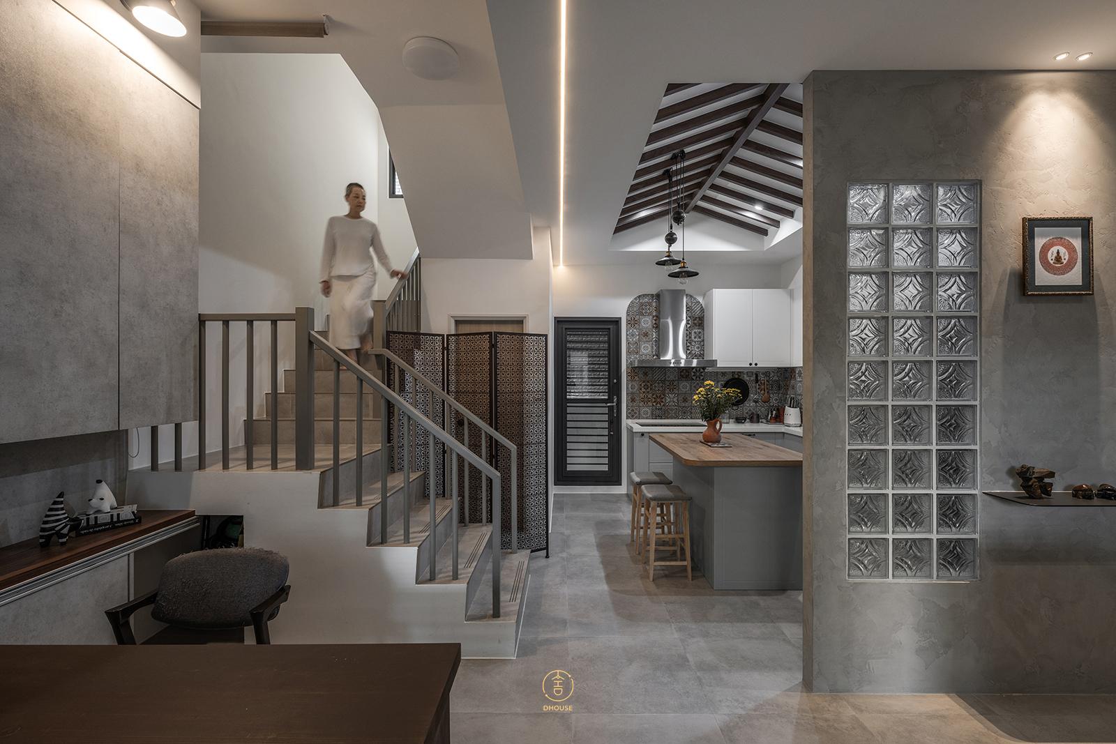 靈感來自屋主的跨國背景,空間中融合了西班牙的建築語彙與中式細節。三角木樑天花、彩色花磚,帶出西班牙的自由與熱情;中式屏風、海棠花壓花玻璃與榫卯工藝,則傳遞東方的細膩與傳統精神。