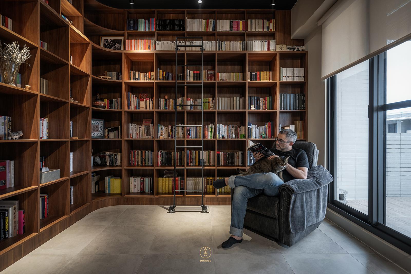 臥室延續屋主兒時的生活記憶,以藤編、燈串與復古壓花玻璃營造懷舊氛圍。書房則結合深木色調與弧形書牆,搭配屋主收藏的古董家具與藝術作品,創造沉浸式的閱讀體驗。