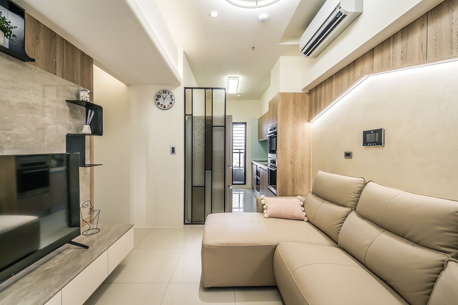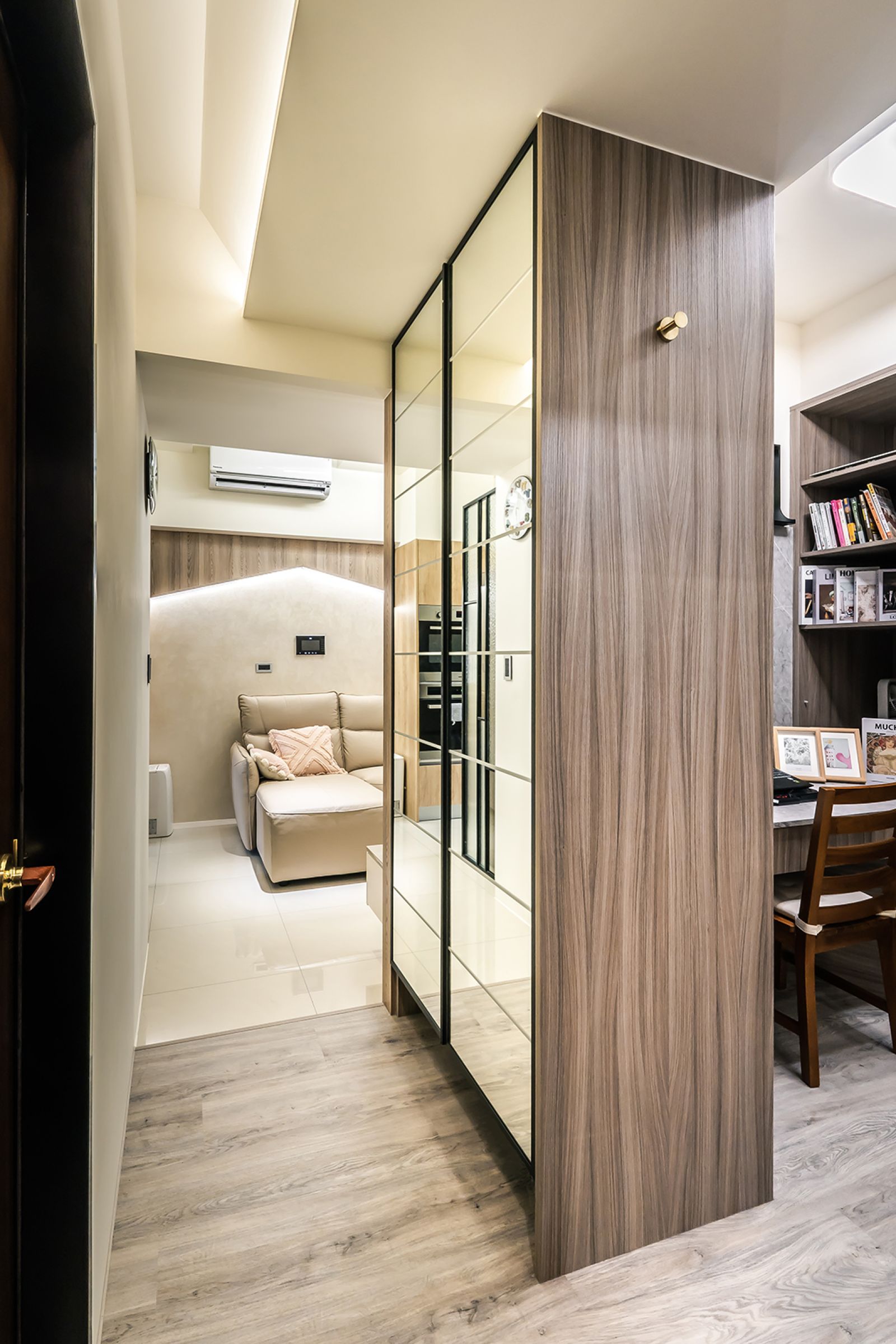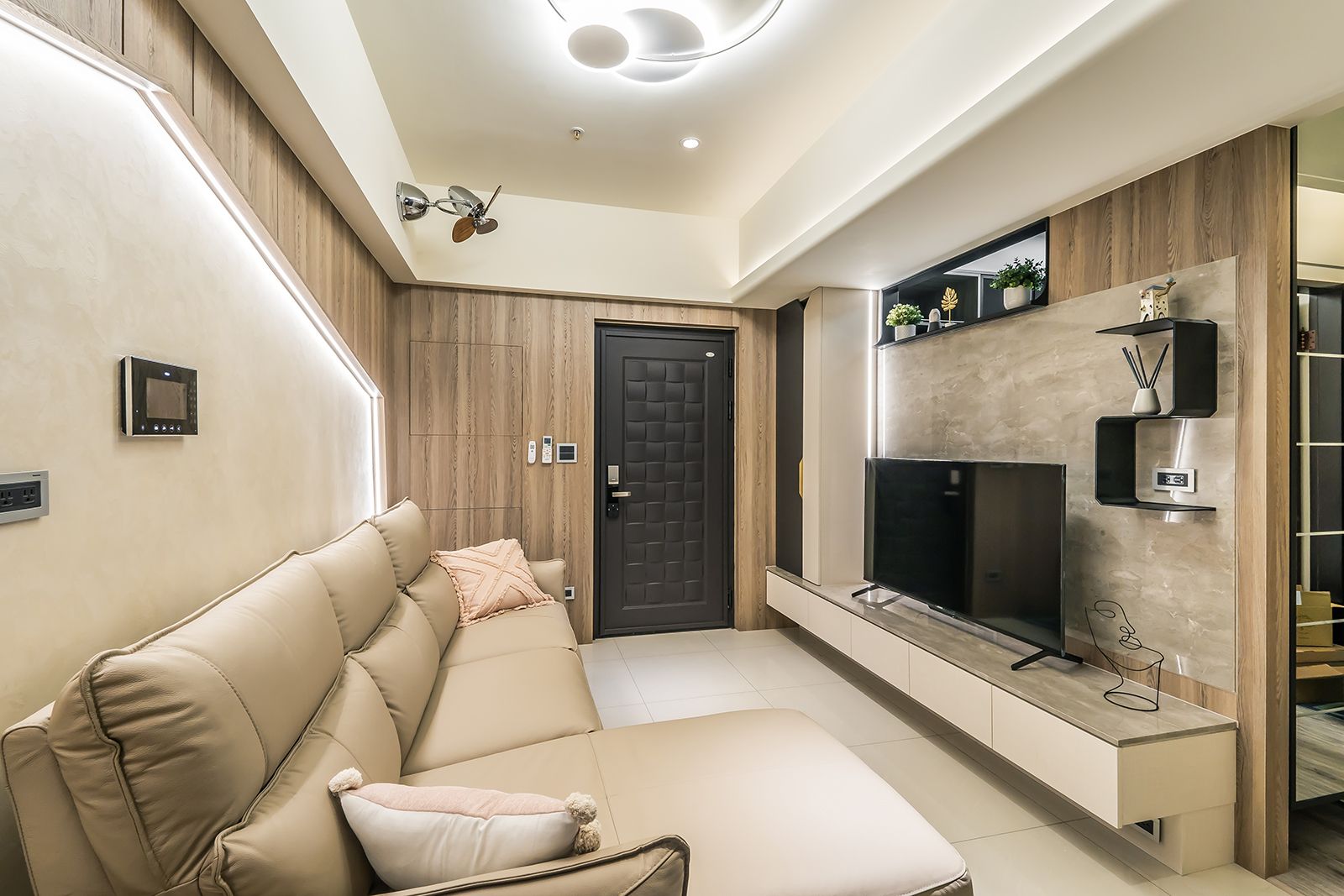 透過大理石、精緻鐵件、雲霧感珠光特殊塗料、皮件,呈現小宅精緻的高級感