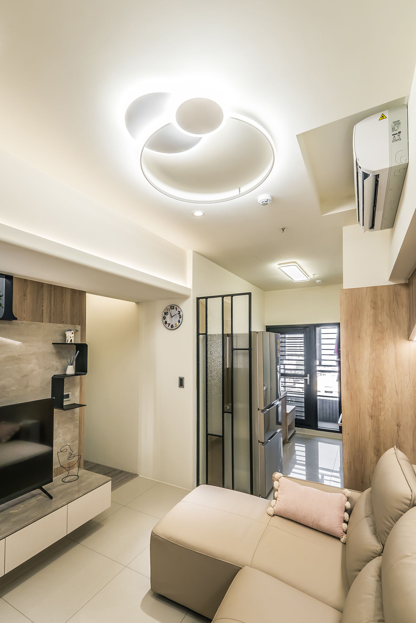 透過橫樑的修飾弱化,搭配U型、斜T型、流動感的造型天花板設計