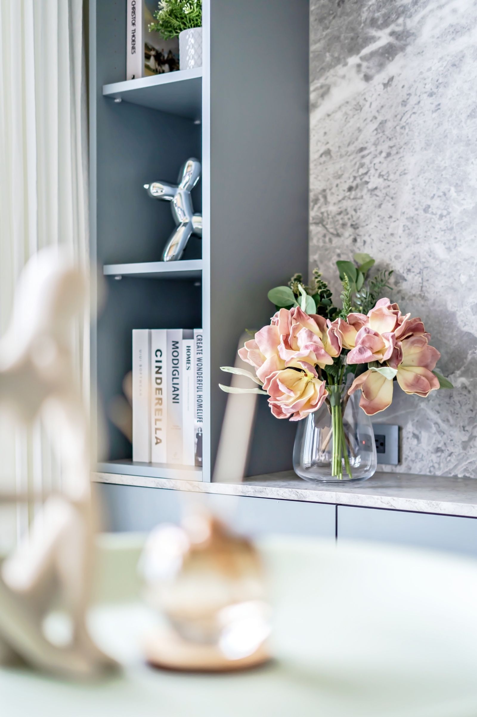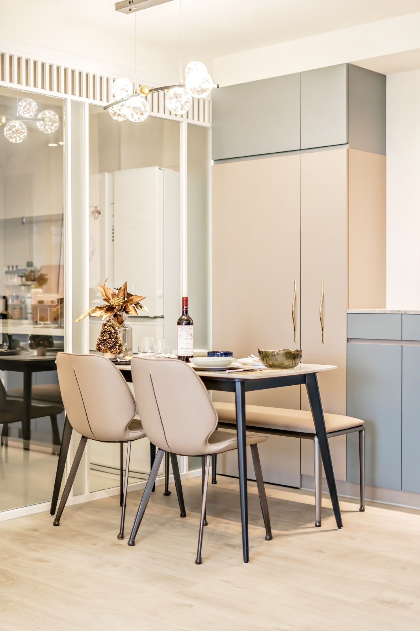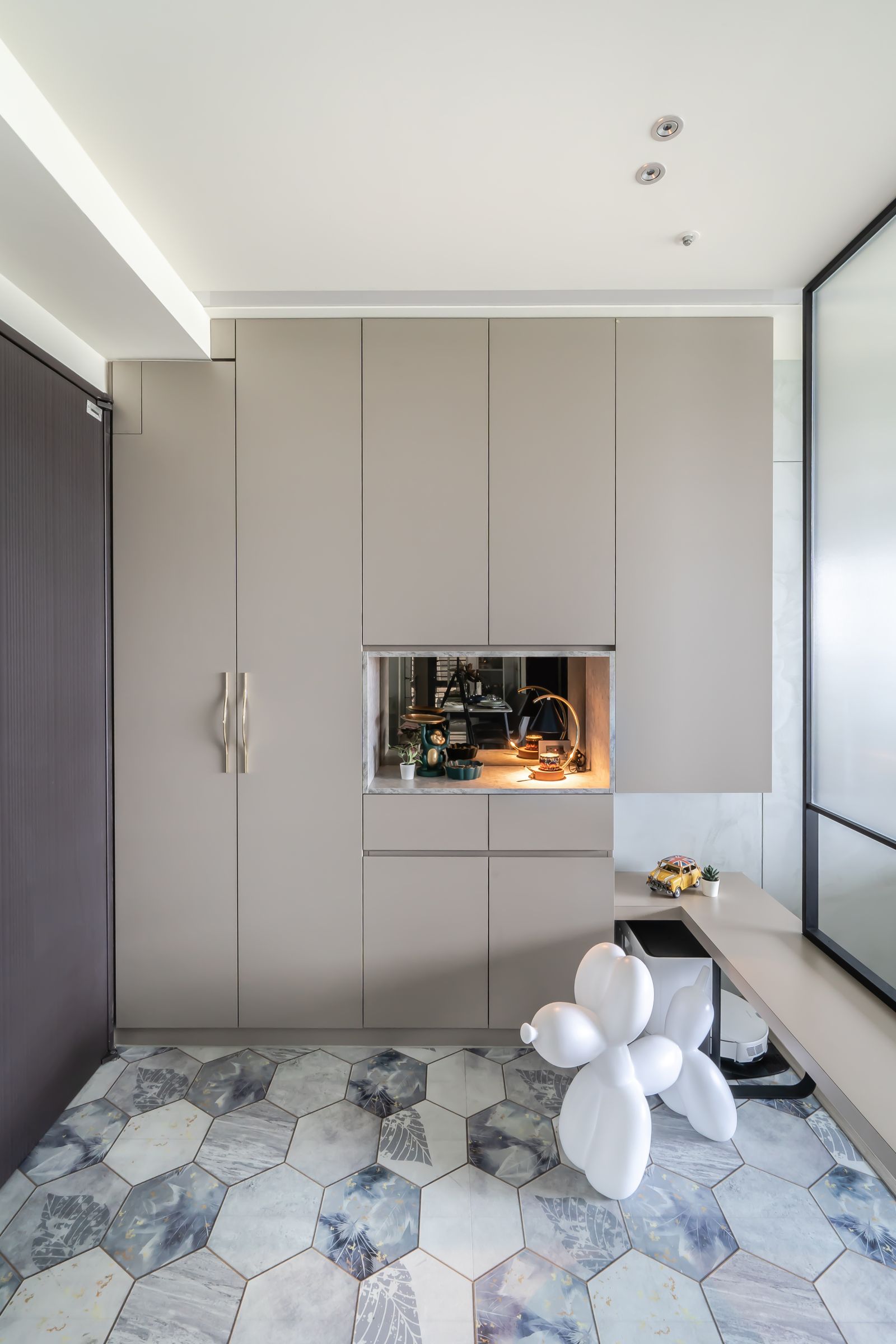 主要材料∥ 鐵件、茶玻、鍍鈦金屬、烤漆、人造石、長虹玻璃、調色灰泥塗料、客製石紋對花美耐板、義大利藝術塗料、髮絲紋面板